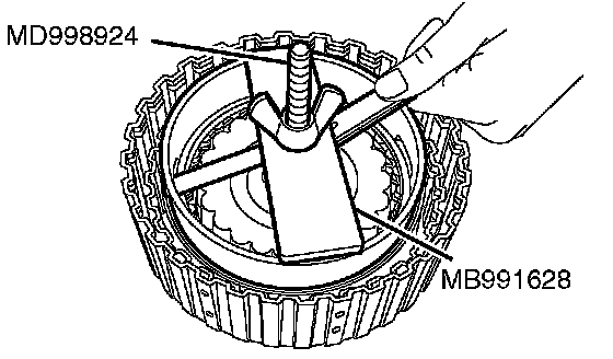 2. Set special tools MB991628 and MD998924 as shown in the illustration, and compress the clutch element.