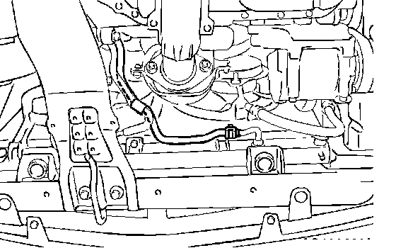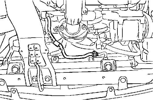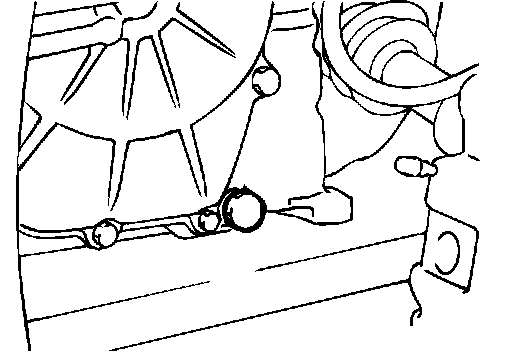 1. Disconnect the hose shown in the illustration which connects the transaxle and the oil cooler (inside the radiator). Place a container under the hose to collect the discharge.
