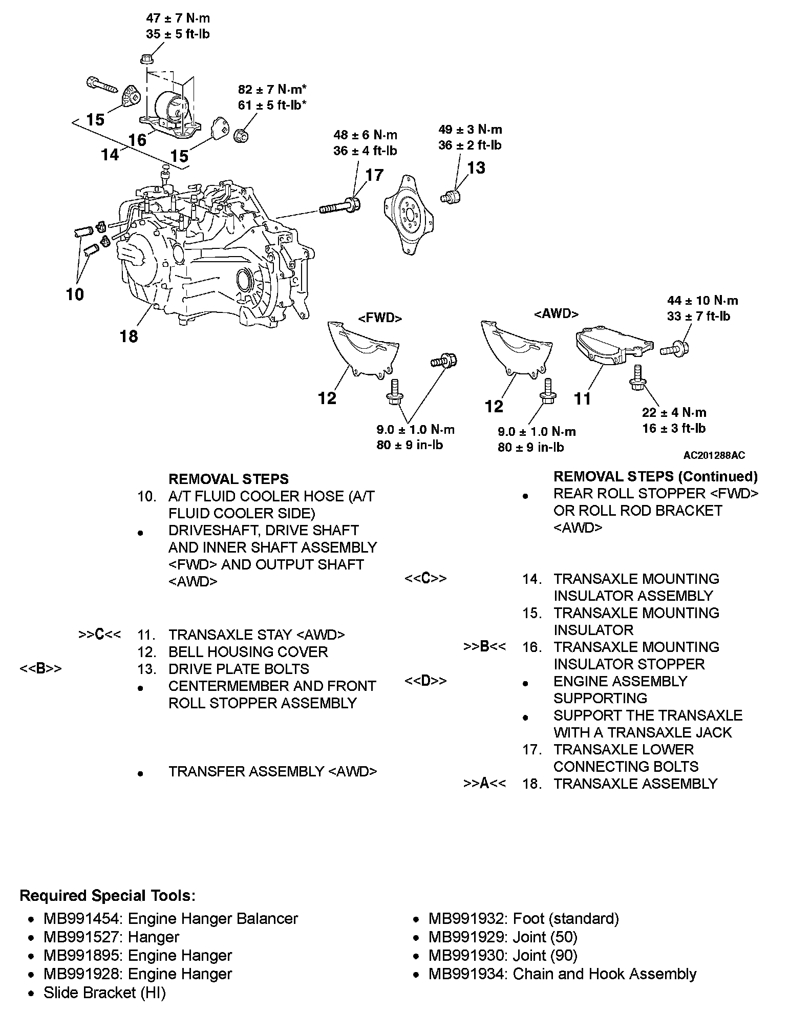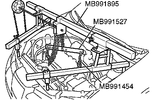 3) Set the special tools MB991454 and MB991895, support the engine transaxle assembly, and unscrew the transaxle assembly upper part coupling bolts that were priority loosened.