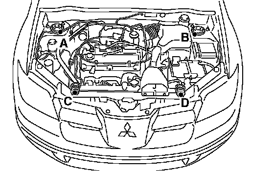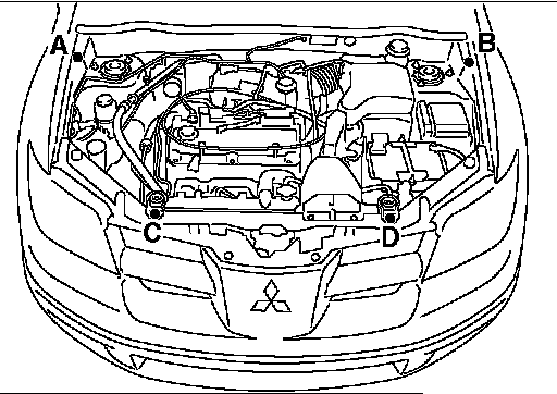 1) Set the special tool MB991895 to the front fender assembling bolt (A, B) and radiator upper insulator assembling bolt (C, D) inside the engine room, as shown in the figure of the instructions.