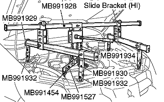 1) Assemble the engine hanger (special tool MB991928). Set following parts to the base hanger.