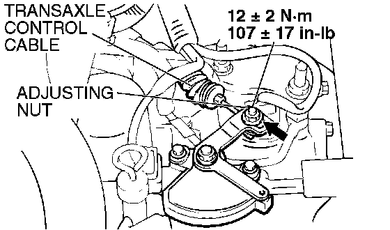 2. Place the cable stud into the manual control lever slot and install the adjusting nut loosely. Gently push the transaxle control cable into the manual control lever slot until the cable is taut. Tighten the adjusting nut to the specified torque.