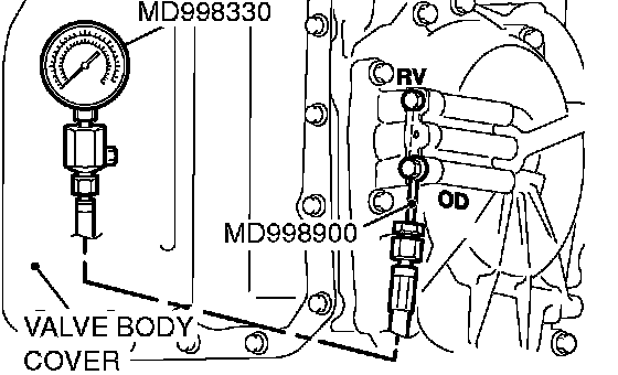 3. Connect the special tools (3.0 MPa (427 psi) oil pressure gauge [MD998330] and adapters [MD998332, MD998900]) to each pressure discharge port.