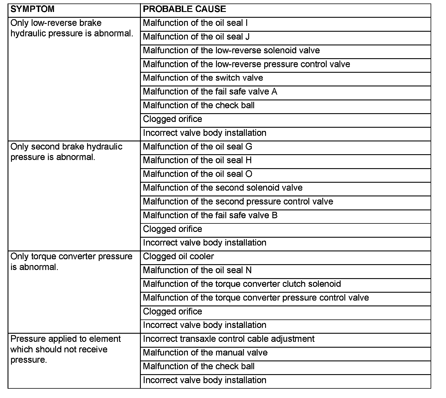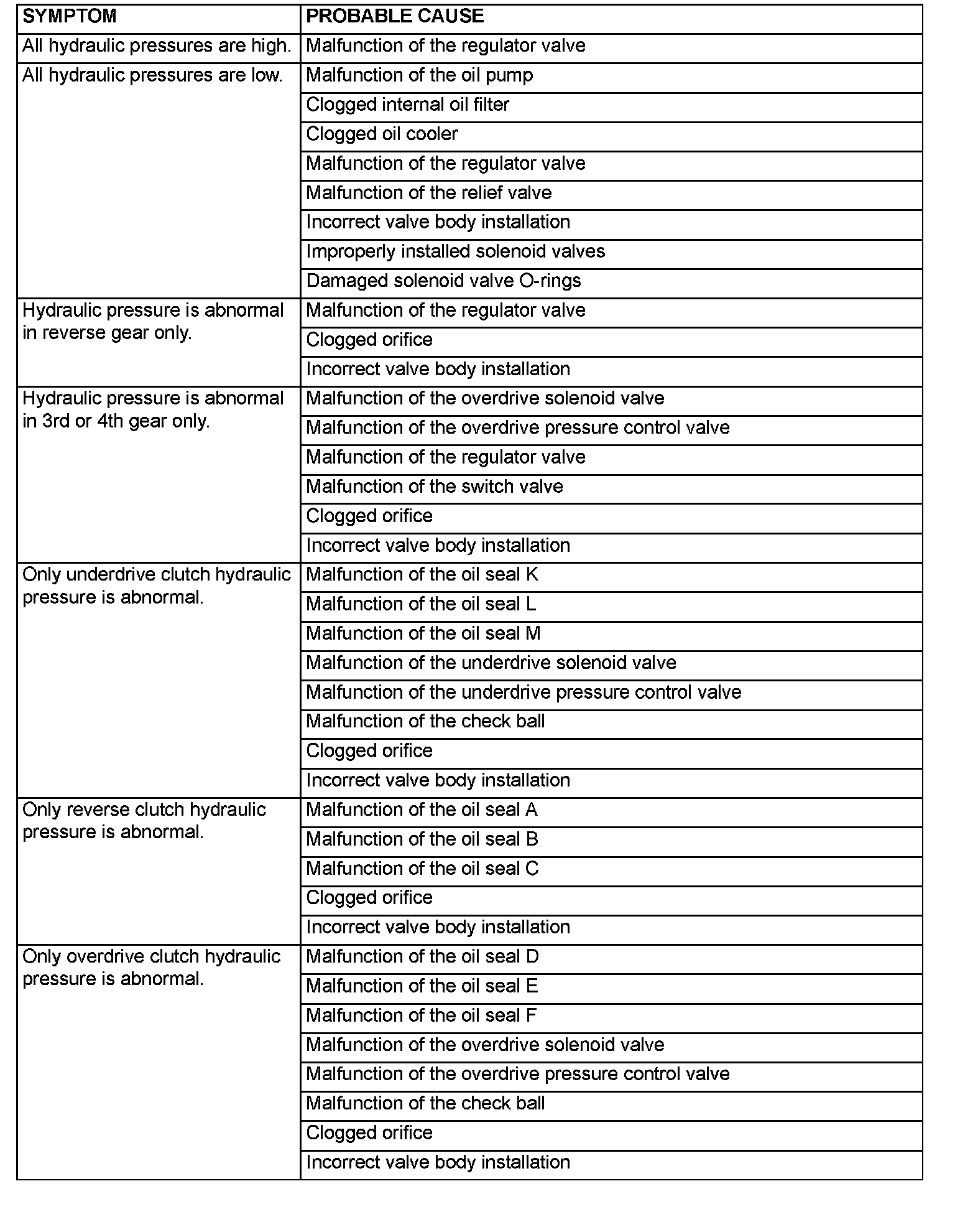 HYDRAULIC PRESSURE TEST DIAGNOSIS TABLE: