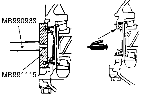 Use the special tools MB990938 and MB991115 to press-fit the oil seal.