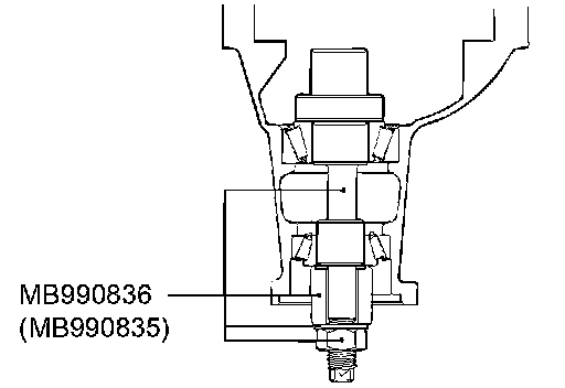 2. Install special tool MB990836, drive pinion front and rear bearing inner races to the differential carrier as shown in the illustration.