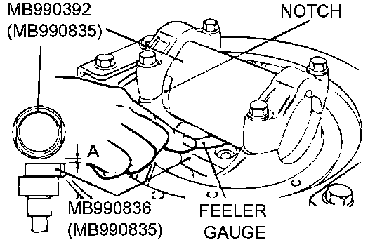 6. Use a feeler gauge to measure the clearance (A) between special tools MB990392 and MB990836.