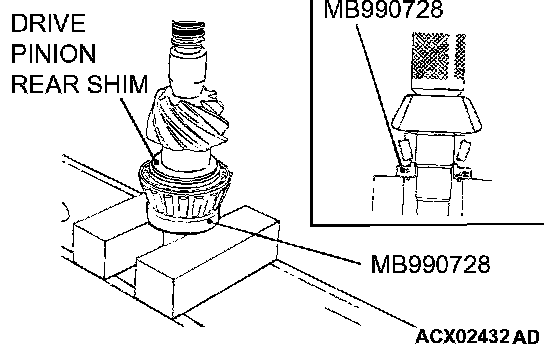 11. Fit the selected drive pinion rear shim(s) to the drive pinion, and press-fit the drive pinion rear bearing inner race by using the special tool MB990728.