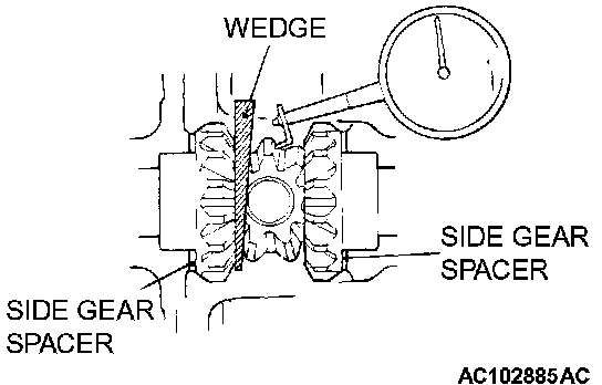 4. While locking the side gear with the wedge, measure the differential gear backlash with a dial indicator on the pinion gear. Measure by the same procedure for the other pinion gear.