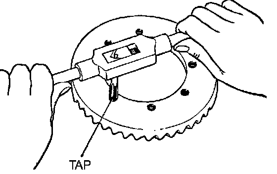 2. Remove the adhesive adhered to the threaded holes of the drive gear by turning the tap (M10 x 1.25). Clean the threaded holes by applying compressed air.