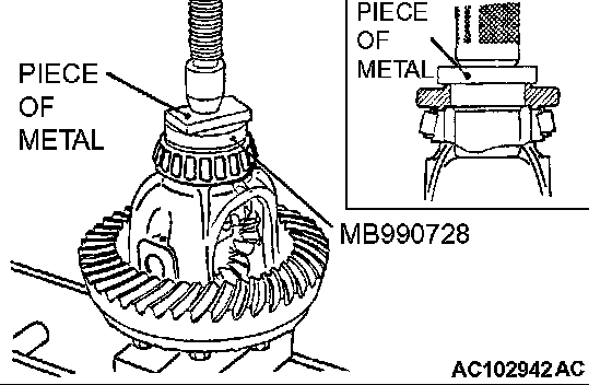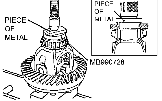 6. Use the special tool MB990728 to press-fit the side bearing inner race into the differential case. After installing the outer race, assemble the differential case to the differential carrier.
