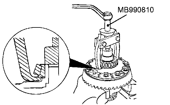 NOTE: Hook the claws of the special tool MB990810 with the side bearing inner race by using the notches (two areas) of the differential case side.