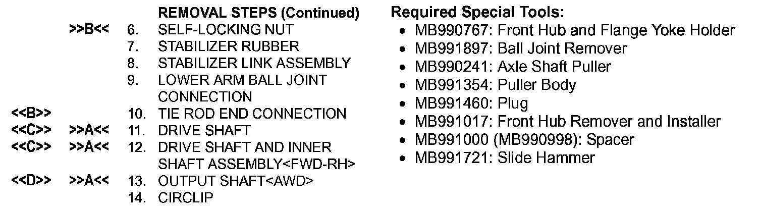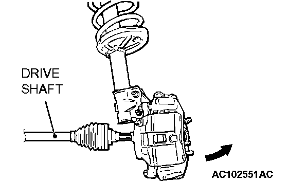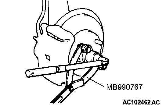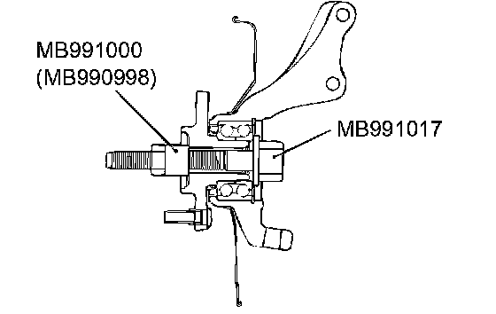 CAUTION: Do not apply pressure to the wheel bearing by the vehicle weight to avoid possible damage when the drive shaft is removed. If, however, vehicle weight must be applied to the bearing in moving the vehicle, temporarily secure the wheel bearing by using the special tools MB991000 (MB990998) and MB991017.