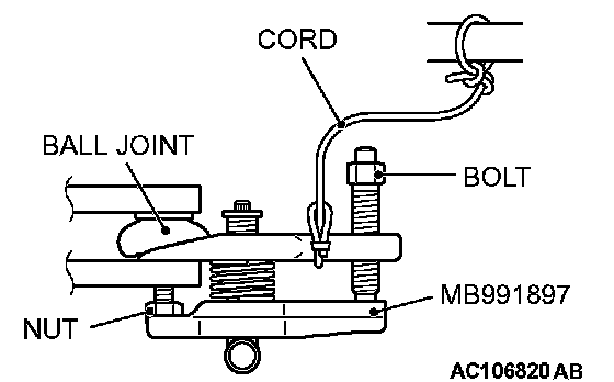 ^ Do not remove the nut from ball joint. Loosen it and use special tool MB991897 to avoid possible damage to ball joint threads.