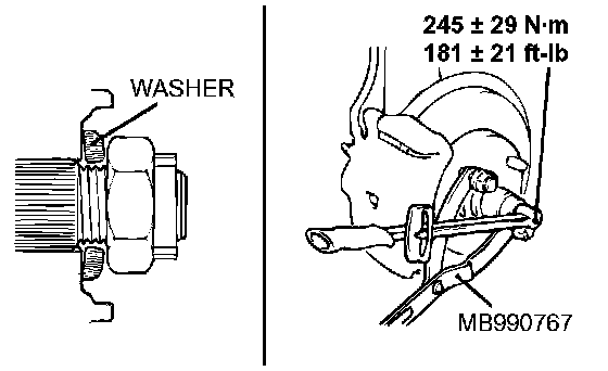 2. Using special tool MB990767, tighten the drive shaft nut to the specified torque.