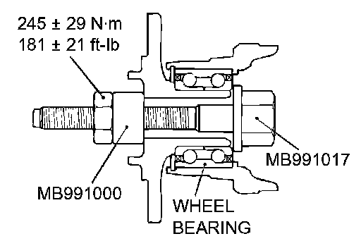 CAUTION: Do not apply pressure to the wheel bearing by the vehicle weight to avoid possible damage when the drive shaft is removed. If, however, vehicle weight must be applied to the bearing in moving the vehicle, temporarily secure the wheel bearing by using the special tools MB991000 and MB991017.