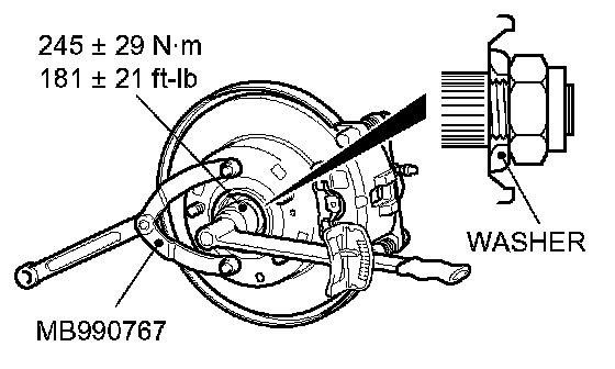 2. Tighten the drive shaft nut to the torque specification with special tool MB990767.
