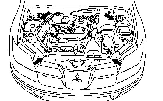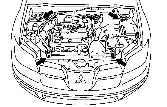 2. Set the engine hanger (special tool MB991928) to the strut mounting nuts and the radiator support upper insulator mounting bolts, which are located in the engine compartment, as shown.