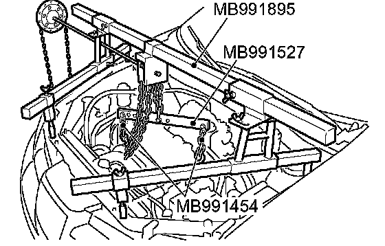 3. Set special tools MB991454 to hold the engine/transaxle assembly.