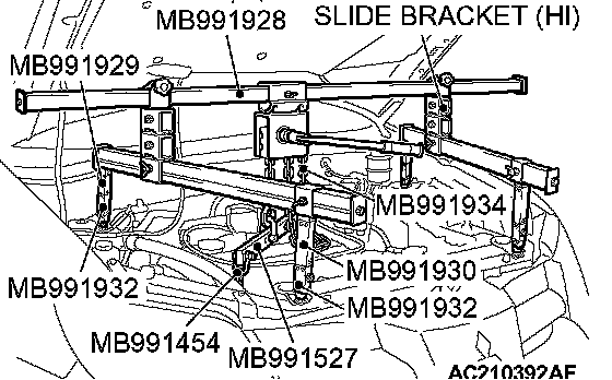 1. Set special tool MB991895 to the strut mounting nuts and the radiator support upper insulator mounting bolts, which are located in the engine compartment, as shown.