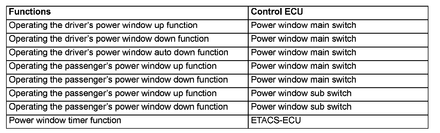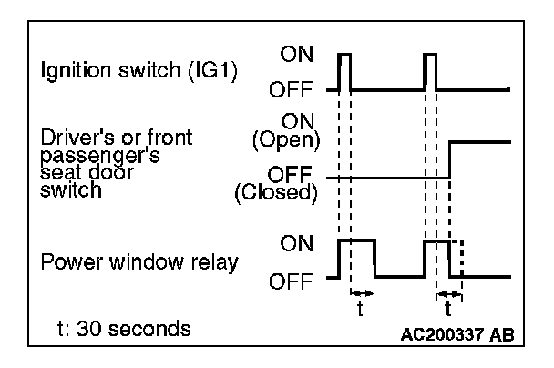 When the ignition switch is turned to the "ON" position, the power window relay are turned ON. After the ignition switch is turned OFF, the system continues to turn ON the power window relay for about 30 seconds and to enable the opening and closing of the door window by the power window switch. When the driver's or front passenger's door is opened while the timer is in operation, the power window relay will be turned OFF.