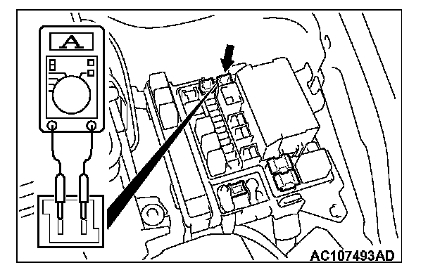 1. Remove the power window fuse and connect an ammeter as shown in the illustration.
